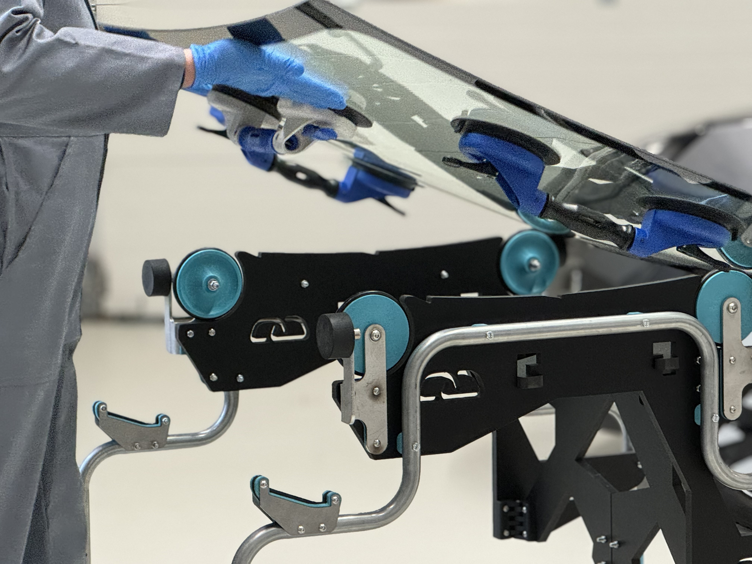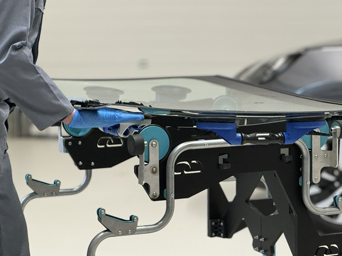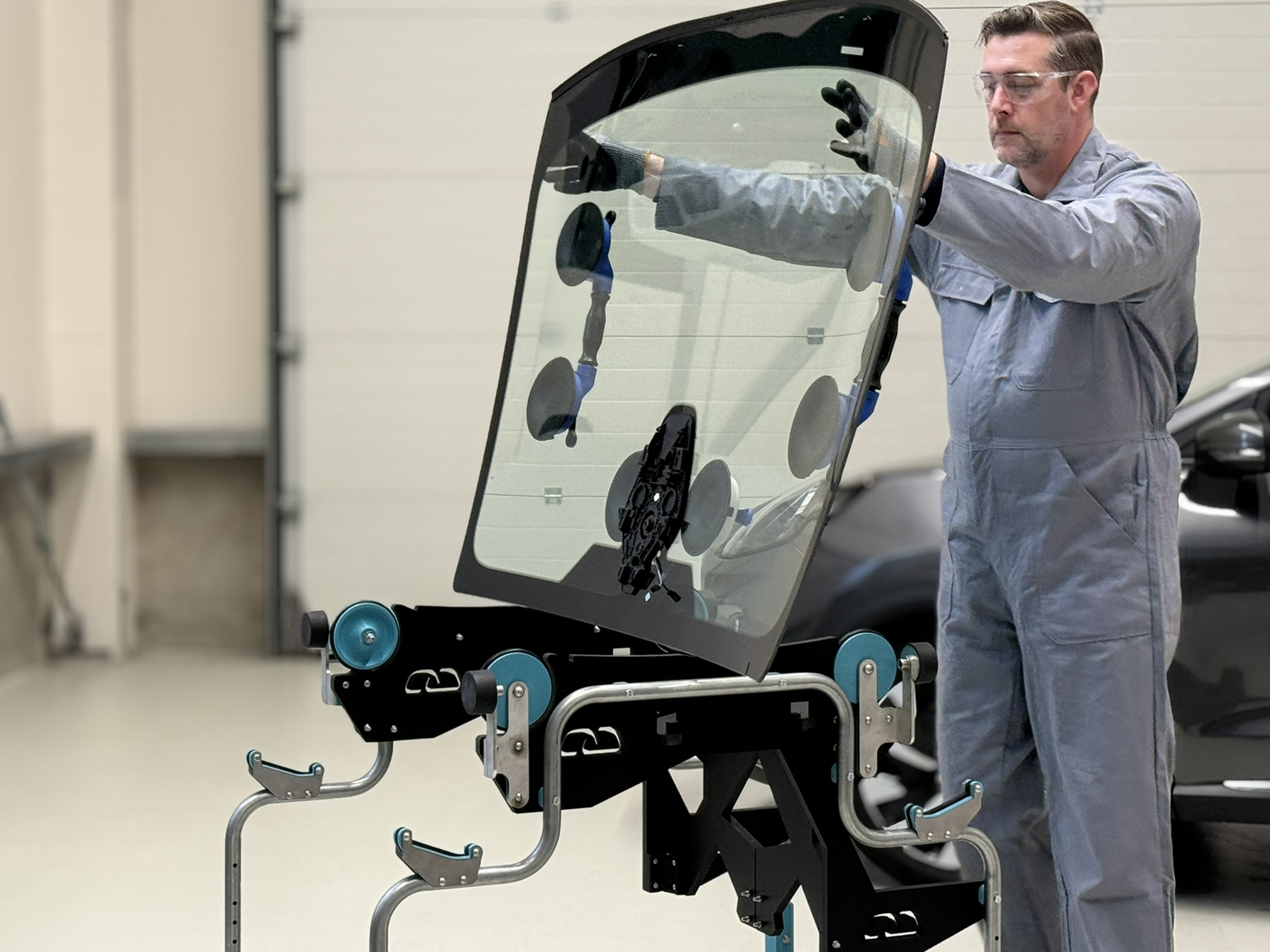 Mit dem SEKURFIT™ Scheibentisch müssen Monteure nicht mehr das volle Gewicht der Windschutzscheibetragen, was die Arbeit erleichtert und die körperlicheBelastung um 40 % reduziert.