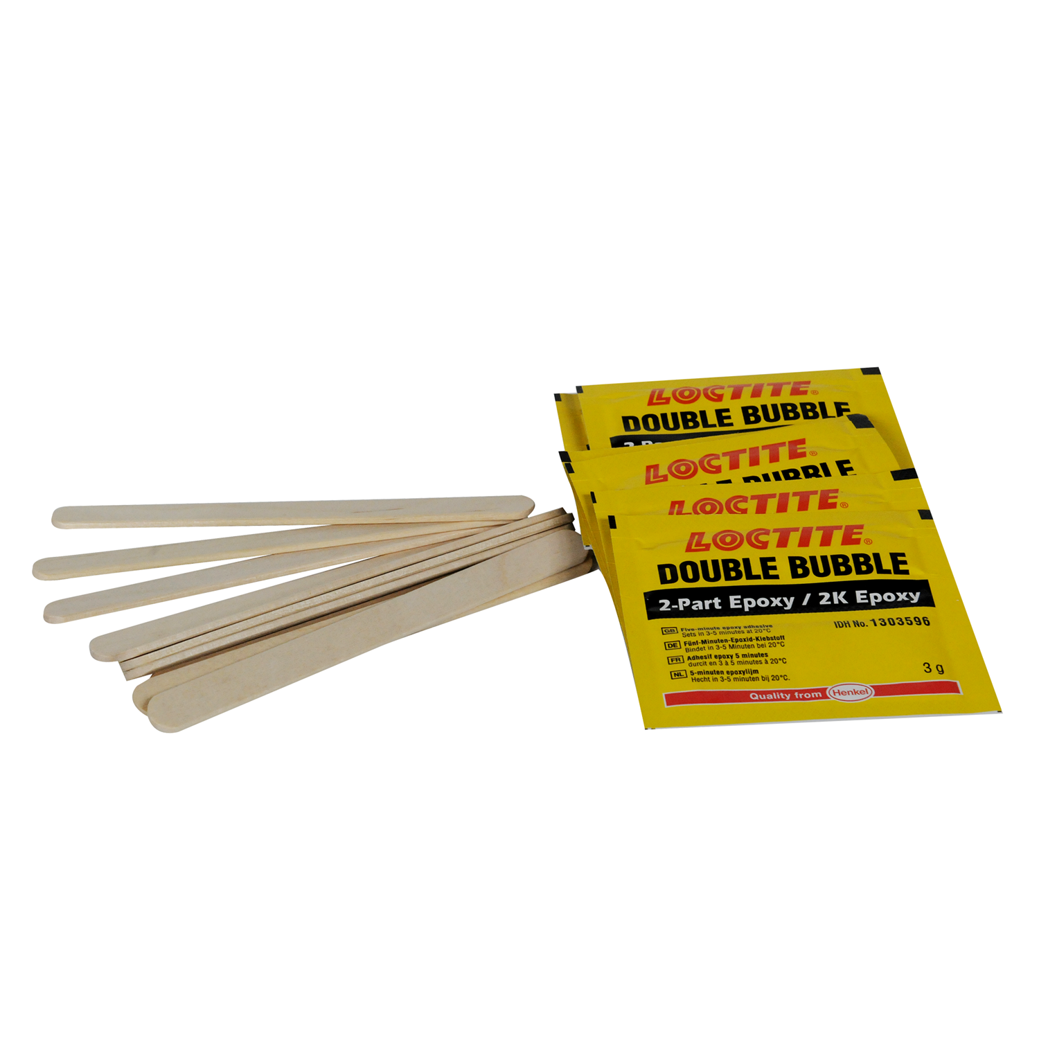 Zweikomponenten-Klebstoff der schnell aushärtet. Die kostensparende 3g-Einzelpackung ist ein ideales Produkt für die Wartung und Reparatur. Set bestehend aus 10 Double Bubble, 10 Rührstäben und 10 Mischpaletten.