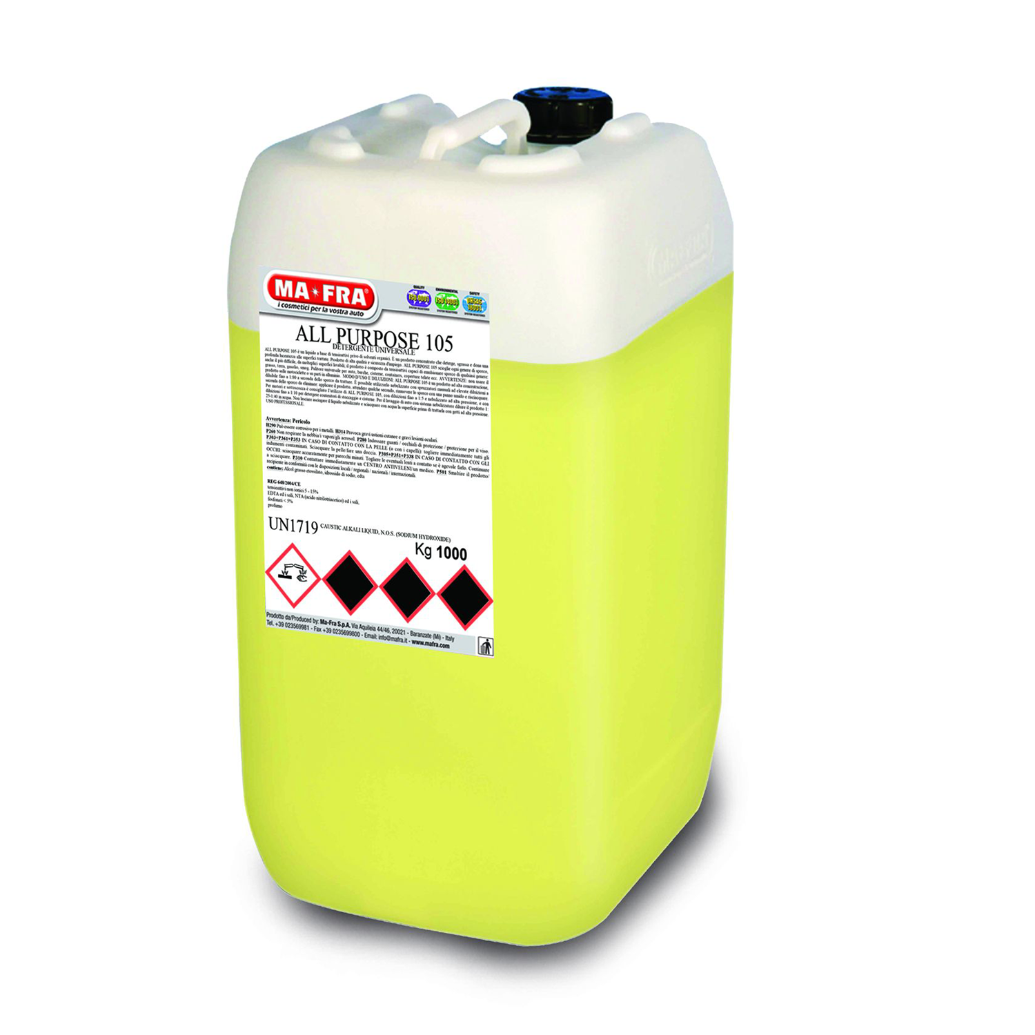 All Purpose 105 ist eine von organischen Lösemitteln freie Flüssigkeit auf Basis von Tensiden. Es handelt sich hierbei um ein Konzentrat, das reinigt, entfettet und auf alle zu behandelnden Oberflächen für einen brillanten Tiefenglanz sorgt. All Purpose 105 löst auch in den schwierigsten Fällen jeder Art von Schmutz von fast allen abwaschbaren Oberflächen. Der Universalreiniger besteht aus aktiven Tensiden, die jede Art von Schmutz lösen. Nicht für Motorräder und Aluminiumoberflächen geeignet.