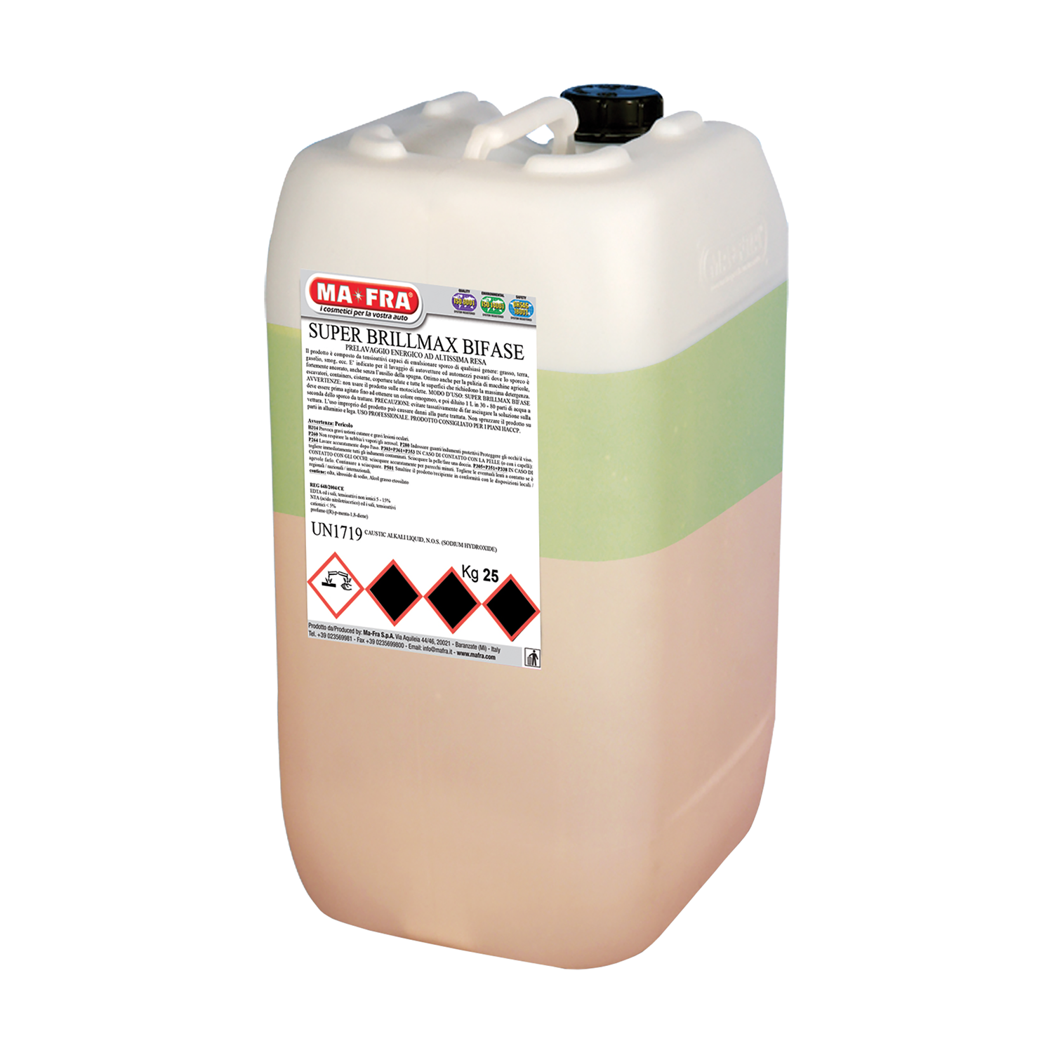 Höchst ergiebiger Kraftreiniger. Anwendungsbereich: SUPERBRILLMAX BIFASE besteht aus Tensiden, die Schmutzablagerungen mühelos entfernen: Fett, Erde, Diesel, Smog, usw. Es eignet sich zur Wäsche von Autos und LKWs an denen besonders hartnäckiger Schmutz zu finden ist und dies ohne die Hilfe eines Schwamms. Vorteile: SUPERBRILLMAX BIFASE eignet sich ausgezeichnet zur Reinigung von Landwirtschaftsmaschinen, Baggern, Containern, Tanks und allen Oberflächen, zu deren Reinigung man höchste Reinigungskraft benötigt. Anwendung und Verdünnung: SUPERBRILLMAX BIFASE muss geschüttelt werden, bis man eine homogene Farbe erhält. Anschliessend wird es 1:30 bis 1:60, je nach Verschmutzung, in Wasser verdünnt. Dann auf die Oberfläche, von unten nach oben sprühen, so erhält man eine homogene Verteilung. Mit einem Hydroreinigungsgerät abspülen.