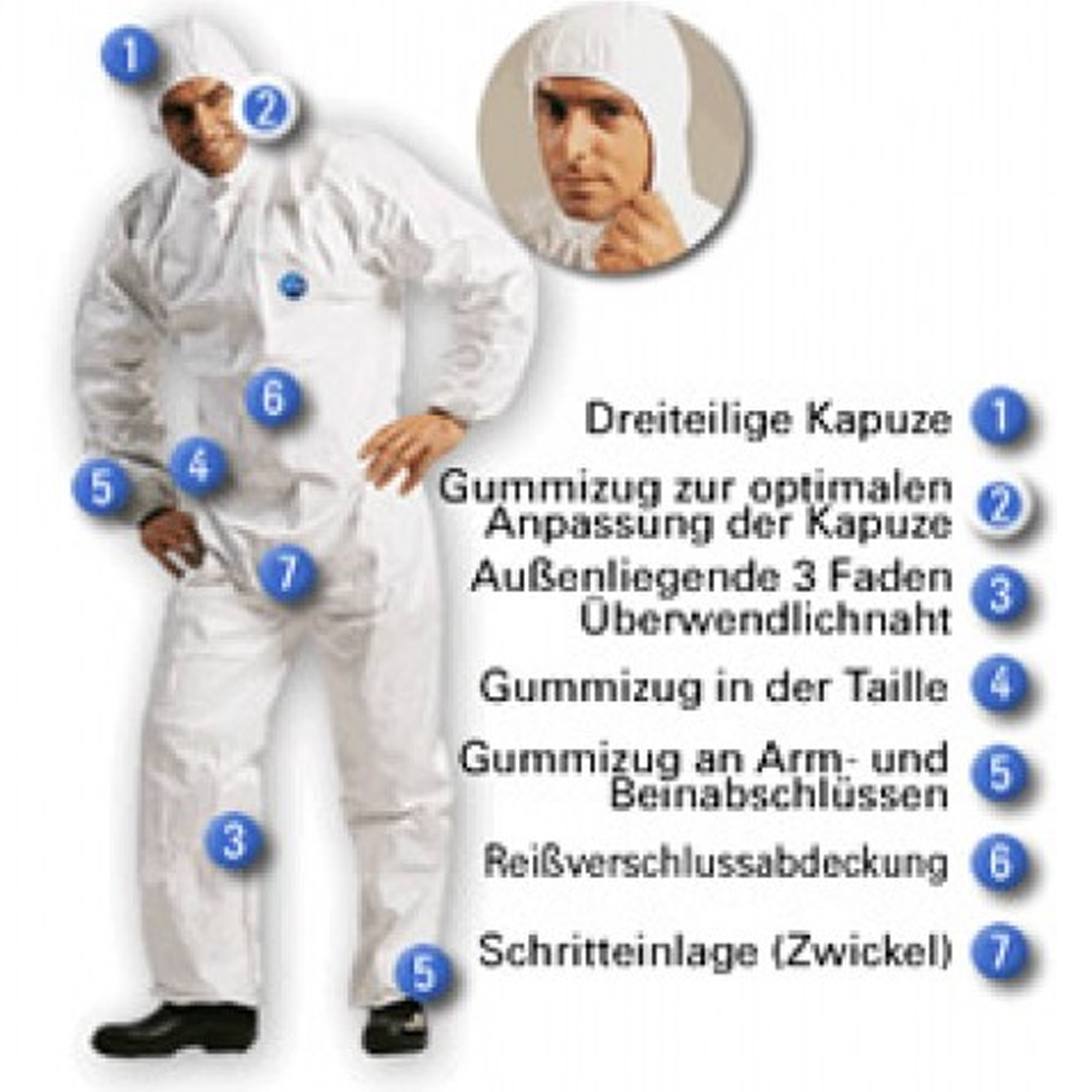 - Schutzanzug Kategorie III - Chemikalien-Schutzkleidung aus Polyethylen - Hoher Barriereschutz gegen anorganische Säuren, Partikeln und Fasern - Robust - Abriebfest - Fusselarm - Atmungsaktiv - Antistatisch - Gummizüge an Ärmel, Kapuze, Bein & Taille - Erhöhte Abdeckblende über der Reissverschlussleiste bis zum Kinn - Aussenliegende Overlock-Naht